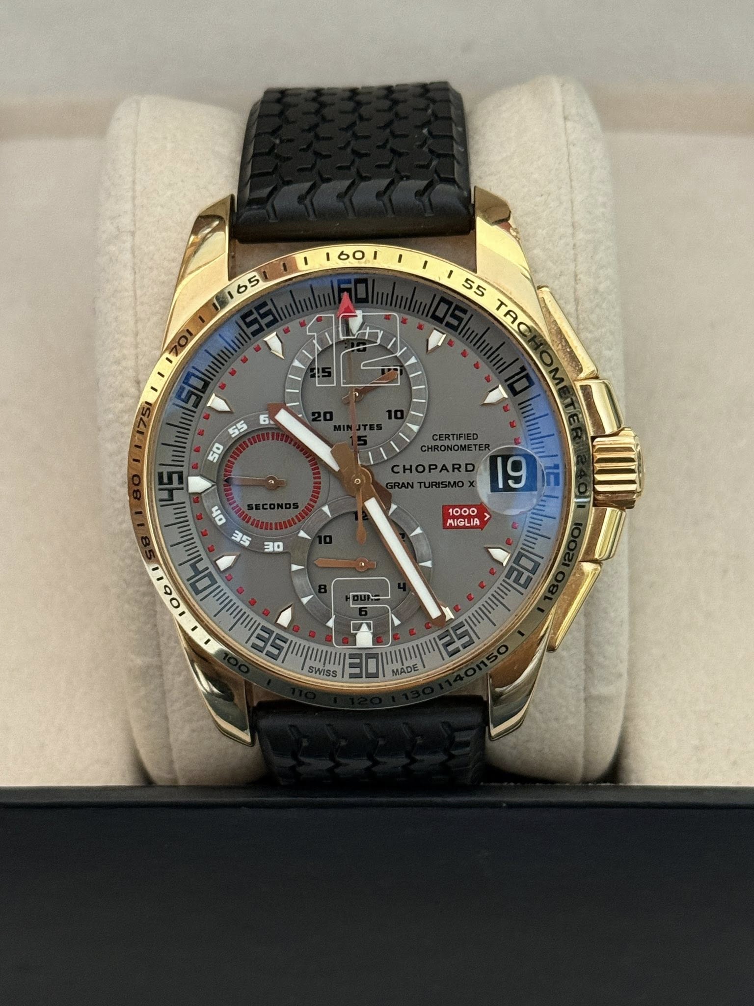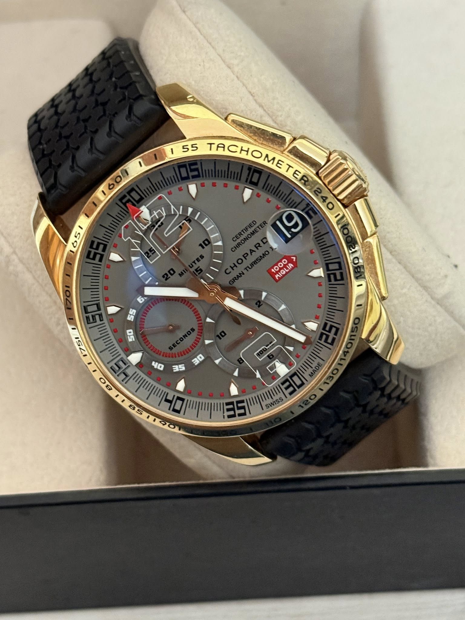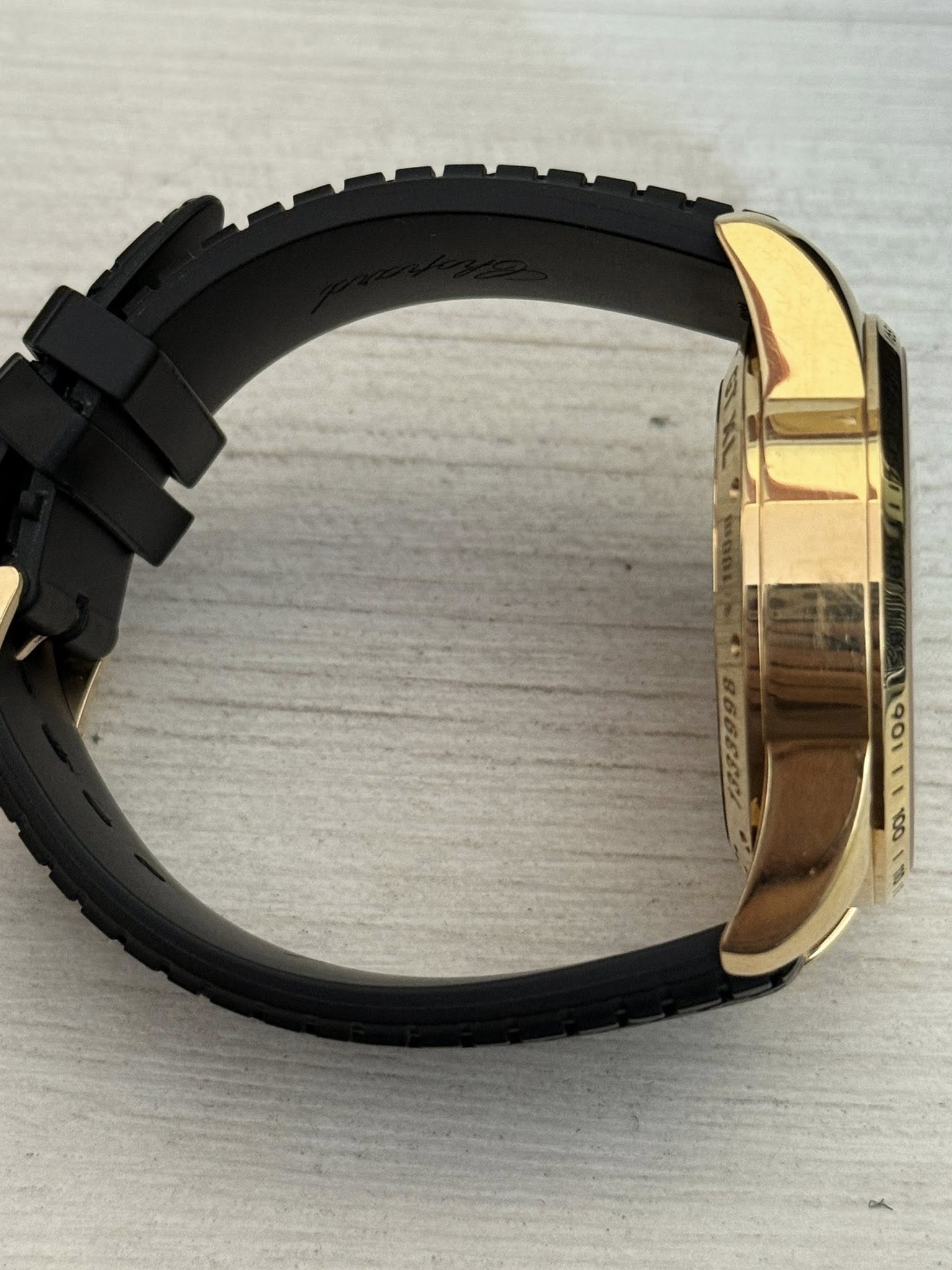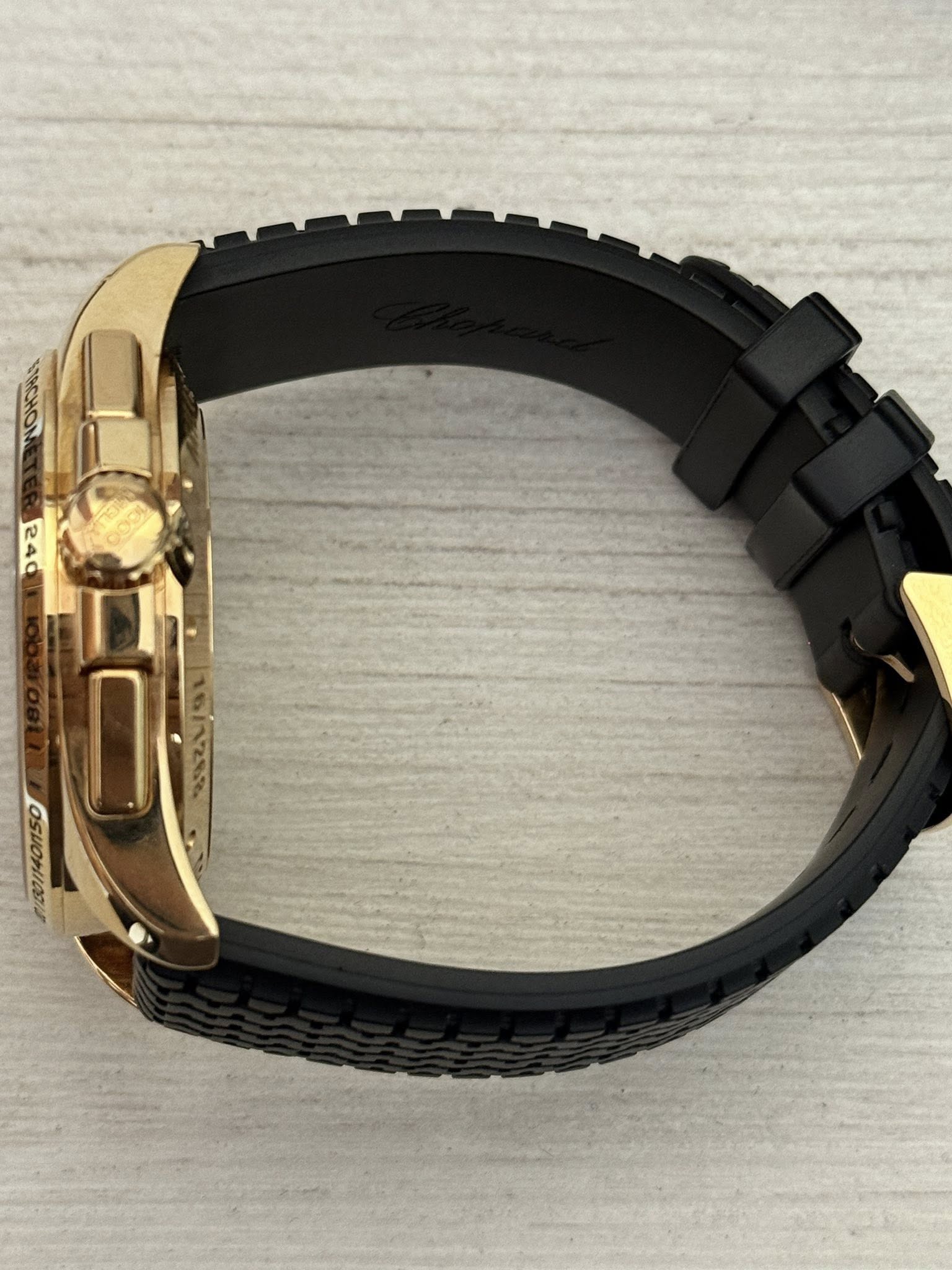 Reloj Chopard en oro 18k de 44mm USADO para caballero, movimiento automatico suizo, cristal safirado, cronografo, correa en goma, corona de rosca, se entrega con estuche-manuales y certificado.