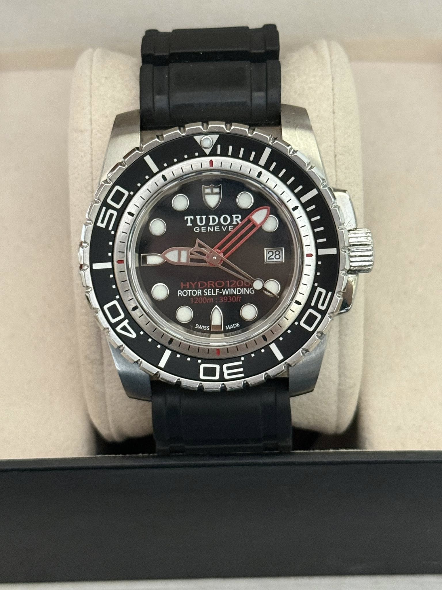 Reloj Tudor de 45mm USADO para caballero, movimiento automatico suizo, cristal safirado, corona y tapa de rosca, correa en goma, se entrega sin estuche.