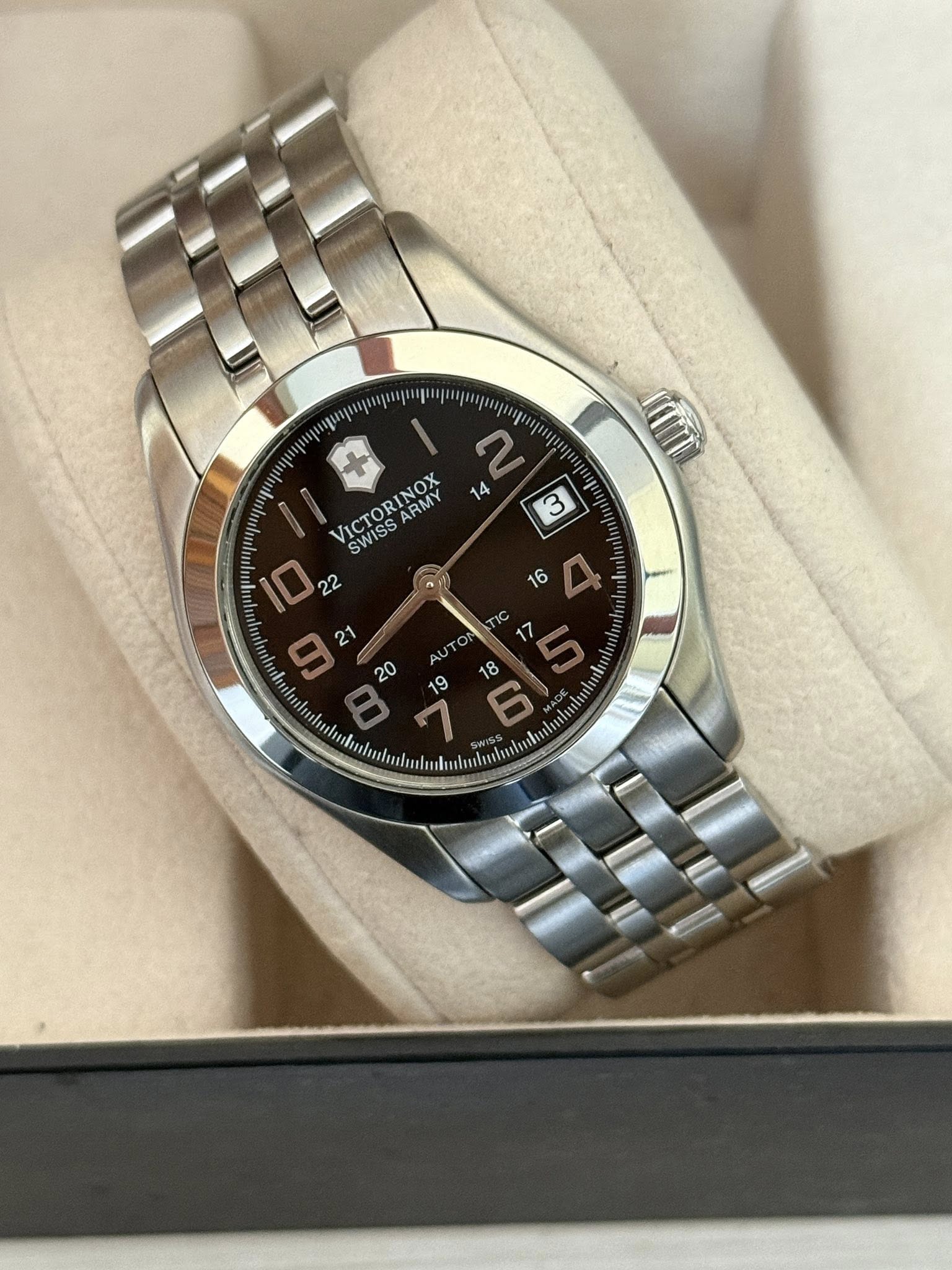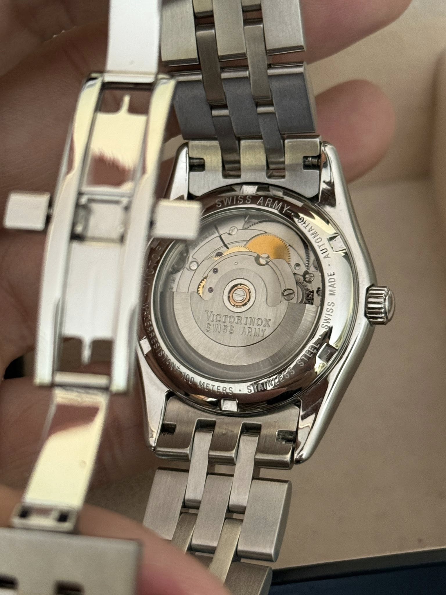 Reloj Victorinox de 38mm USADO para caballero, movimiento automatico suizo, cristal mineral, skeletonback, correa para una muneca de 18cm, NOTA (el reloj tiene algunas rayas en el cristal y su corona fue reemplazada), se entrega sin estuche.